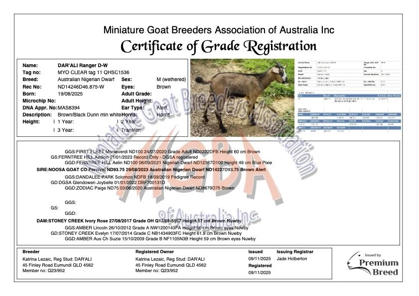 Our herd includes Australian Miniatures sired by Stoney Creek Lucas, a naturally polled buck and son of Dill’s RD Big & Rich, awarded Champion Dwarf Senior Buck (QLD Royal 2022) and Reserve Champion (NSW Mullumbimby 2022). These goats inherit his strong conformation, health, temperament, and naturally polled genetics.