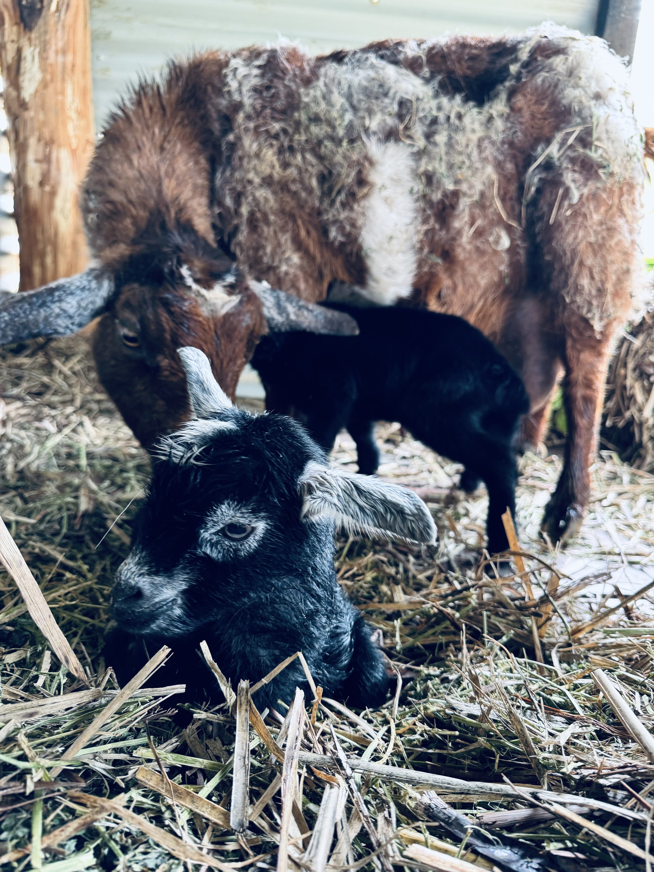 Our two Nigerian Dwarf twins born in Spring 2022, sired by Kamalaya Farm Tulloch and Stoney Creek Maverick, carry top-tier US and Apollo foundation genetics. Arrow shows a bold, independent personality, and Freya is gentle and approachable - both are strong, healthy, and well-formed.