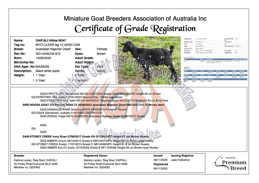 🌿 To achieve our breeding goals, we’ve introduced genetics from leading Australian breeders. Ferntree Hill Farm in Victoria contributes exceptional conformation and strong dairy traits through its purebred Nigerian Dwarf lines, while Glendowen Farm adds proven dairy performance and milk quality. In Spring 2025, all our kids are sired by Percival, a standout Nigerian Dwarf known for his excellent conformation and production. His addition marks an important step in strengthening our herd’s genetic diversity and maintaining our high breeding standards.